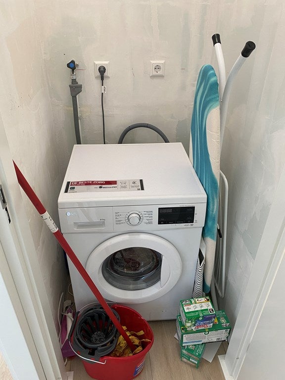 Daarnaast beschikt het appartement over een aparte wasruimte, voorzien van een moderne wasmachine-drogercombinatie.