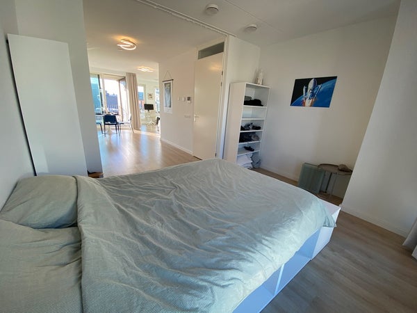 De slaapkamer grenst direct aan de woonkamer en heeft grote ramen met uitzicht op de rustige binnentuin. Door de loftindeling kan de slaapkamer eenvoudig worden afgesloten met gordijnen, waardoor privacy gegarandeerd is.
