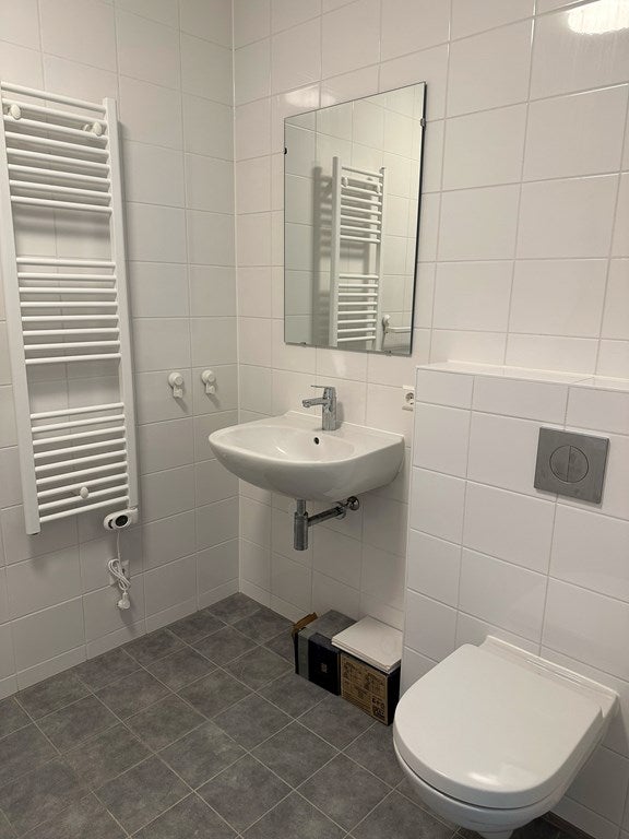 De badkamer is modern en fris, voorzien van een inloopdouche, zwevend toilet en brede wastafel met spiegelverlichting. Door de lichte houten vloer met vloerverwarming voelt het gehele appartement comfortabel en sfeervol aan.