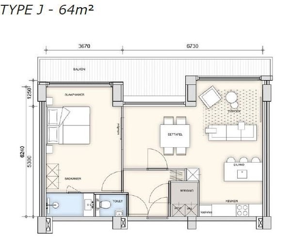 Woonkamer met open keuken voorzien van inbouw apparatuur zoals gaskookplaat, vaatwasser, combi magnetron, koel-/vriescombinatie, afzuigkap en spoelbak. Vanuit de woonkamer toegang tot het balkon. Badkamer voorzien van een douche, toilet en wastafel met spiegel. De slaapkamer heeft voldoende ruimte voor een tweepersoonsbed en een kast. Vanuit de gang is er een apart toilet met fonteintje en een berging met aansluiting voor een was- en droogmachine.