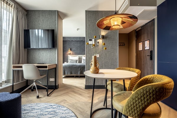 Het gebouw beschikt over een centrale entree met bemande receptie, koffielounge en gratis fitnessruimte. Vanuit hier zijn lift en trap naar de appartementen bereikbaar. Dit appartement op de begane grond heeft een volledig ingerichte keuken met ingebouwde was-/droogcombinatie. De woonkamer is smaakvol ingericht met een comfortabele bank, smart-tv, eettafel en bureau. De slaapkamer heeft een 180×200 cm bed.