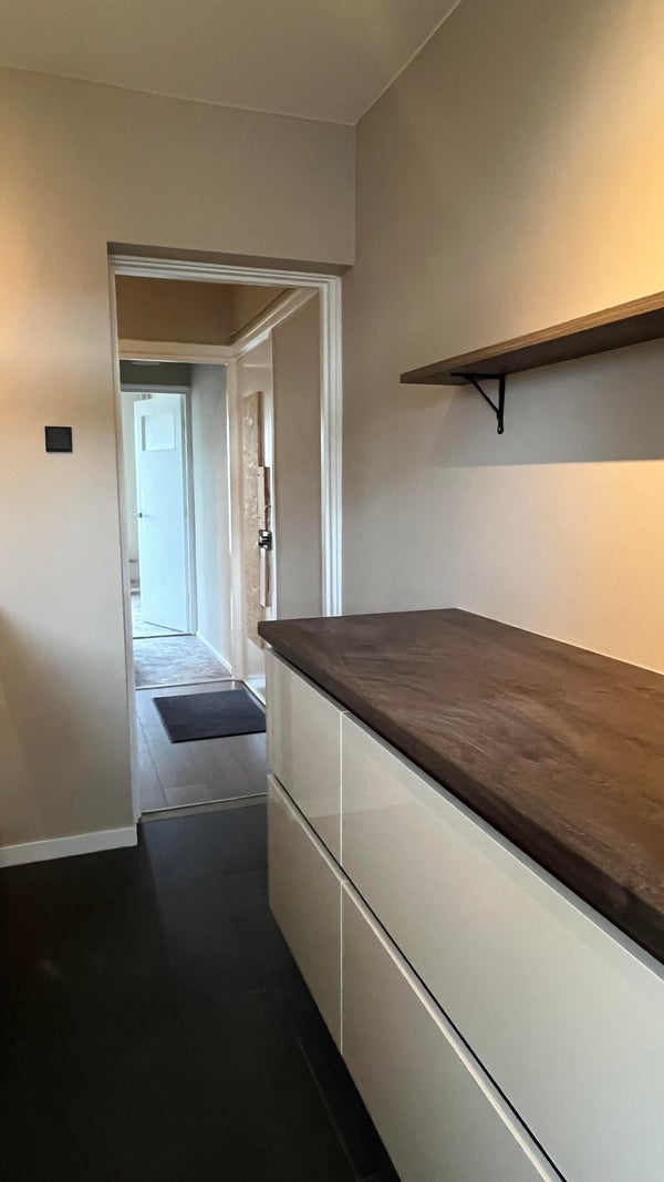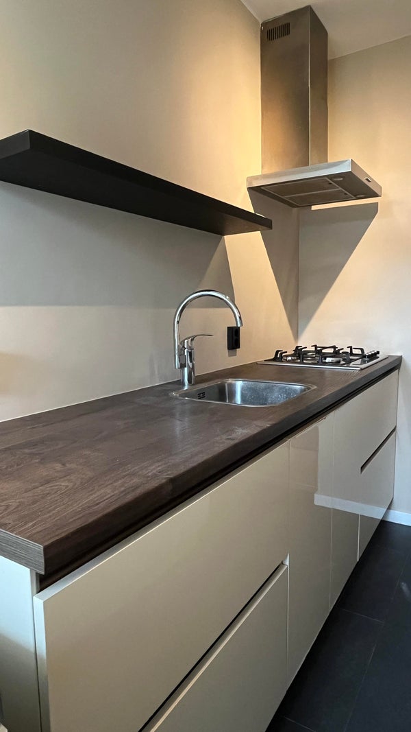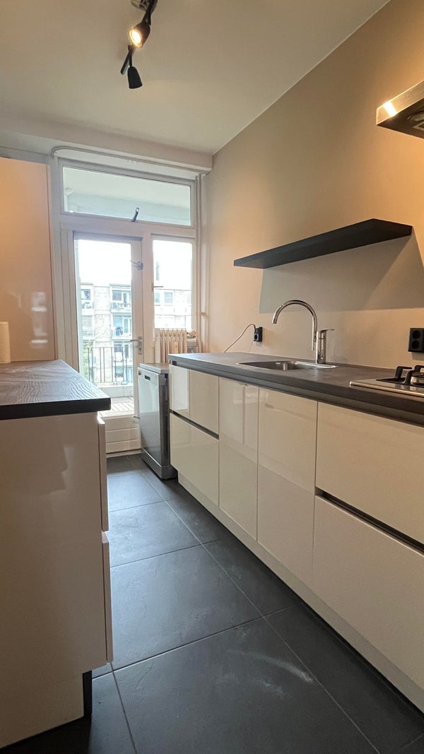 De gesloten keuken is modern ingericht en voorzien van een koelkast, vaatwasser, gaskookplaat met afzuigkap en veel kastruimte. Vanuit de keuken heb je toegang tot het grootste balkon.