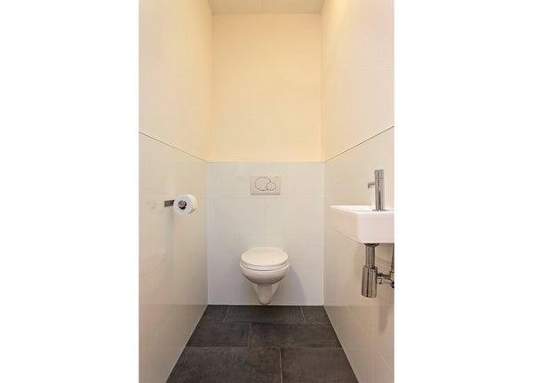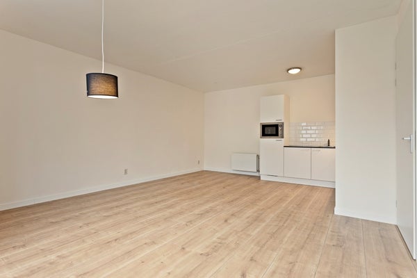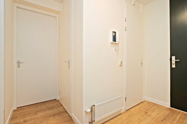 Achter de voordeur komen we allereerst in de hal met meterkast, toilet met fonteintje en berging met de aansluitingen ten behoeve van de wasapparatuur. Aan het einde van de hal is de woonkamer gelegen. Vanuit de woonkamer is het balkon te bereiken.