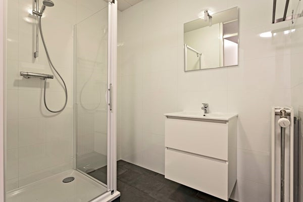 De nieuwe badkamer is uitgerust met een ruime douche en wastafel.