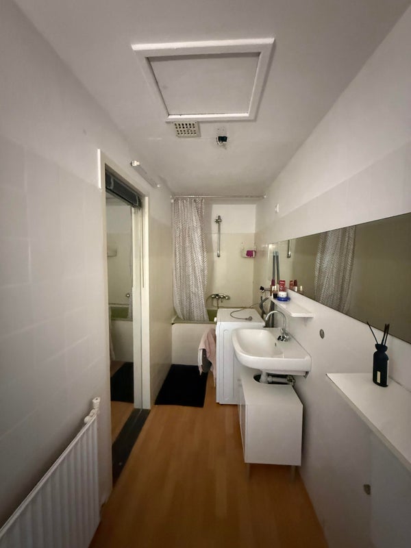 De badkamer heeft een bad met douche en de mogelijkheid om een wasmachine te plaatsen.