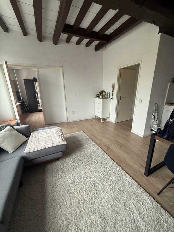 Via de hal loop je de ruime en lichte woonkamer in. De karakteristieke woonkamer is voorzien van mooie houten balken en voorzien van een open keuken.