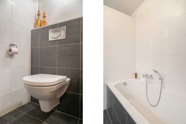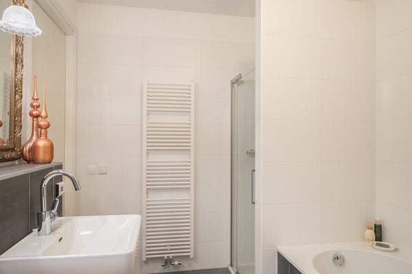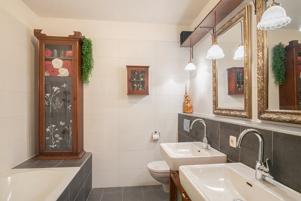 - Badkamer voorzien van alle gemakken: ligbad, aparte douchecabine en een wastafelmeubel met dubbele wasbak met spiegel.