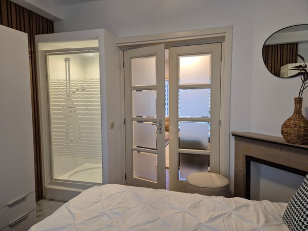 Doorloop naar de nette slaapkamer aan de voorzijde van de woning. In de slaapkamer is een aparte douche geplaatst.
