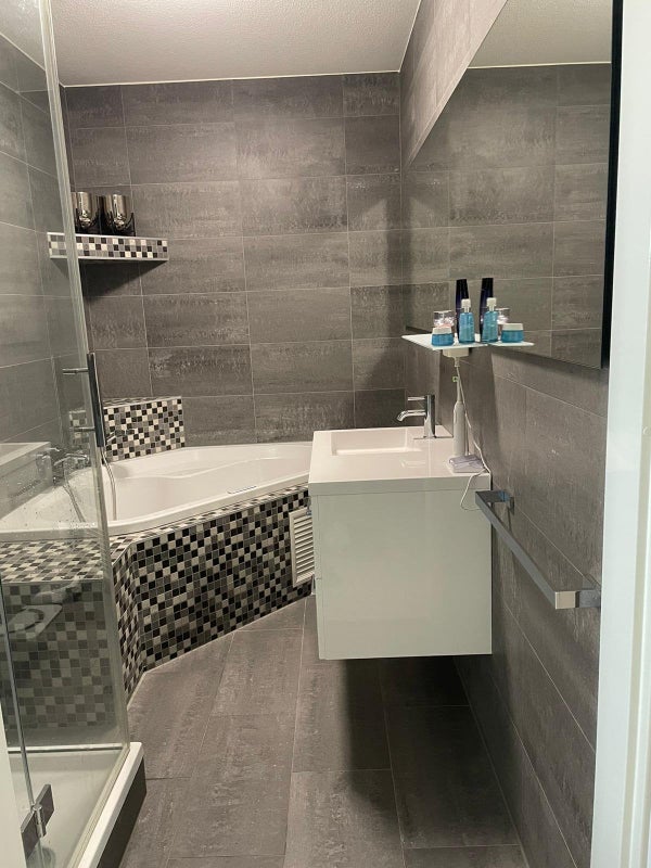 De moderne en geheel betegelde badkamer is fraai ingericht, de badkamer beschikt over een ligbad/jacuzzi en een douchecabine.