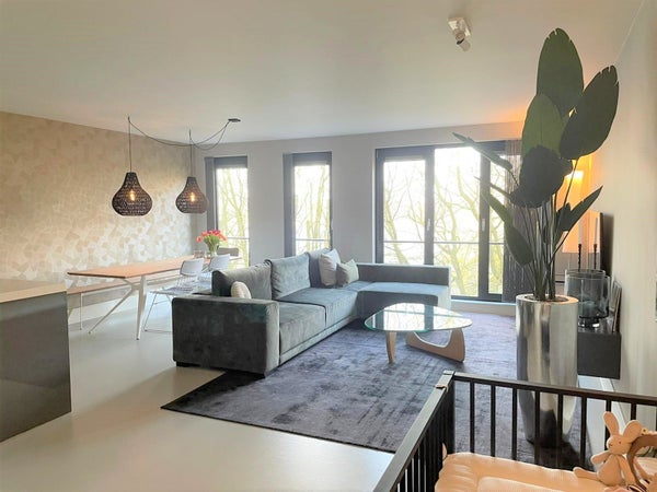 De ruime woonkamer heeft een prachtig uitzicht op het groen en het water, door de hoge raampartijen ontvang je ook veel lichtinval.