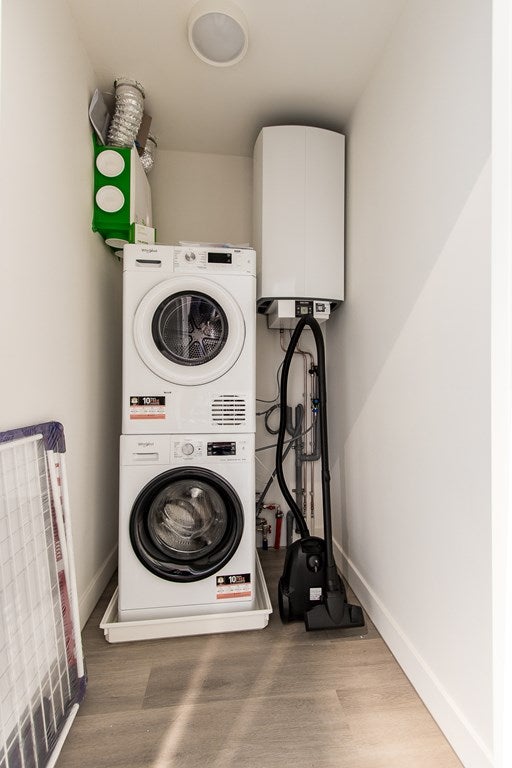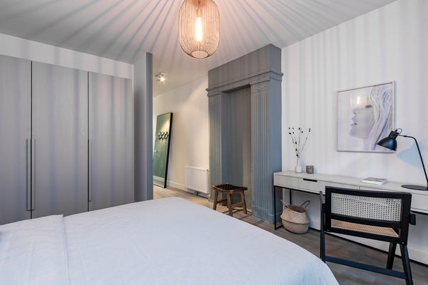 Er is ook een wasmachine en droger. De badkamer heeft een inloopdouche en wastafel en toilet. Aan de achterkant van het appartement is de slaapkamer met een tweepersoonsbed en grote kast. Er is ook een bureau.