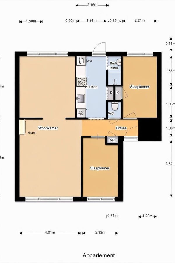 -Twee slaapkamers, waarvan één aan de achterzijde en een aan de voorzijde.