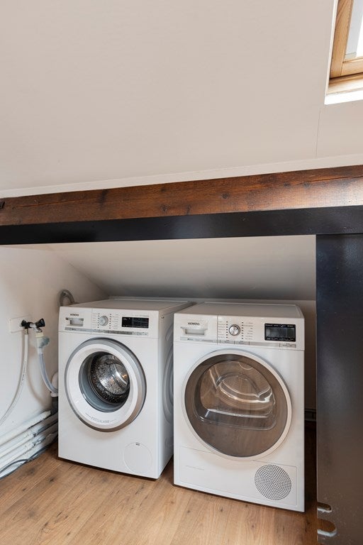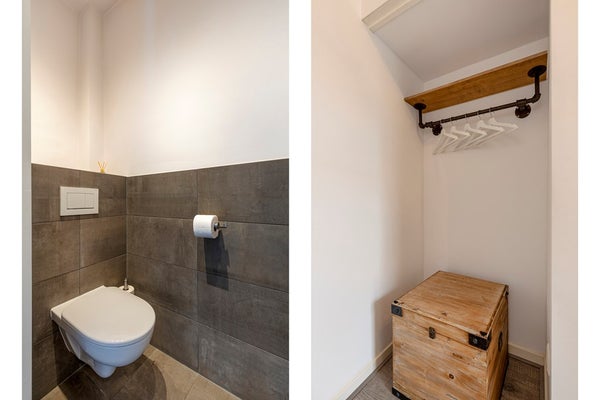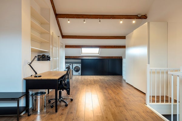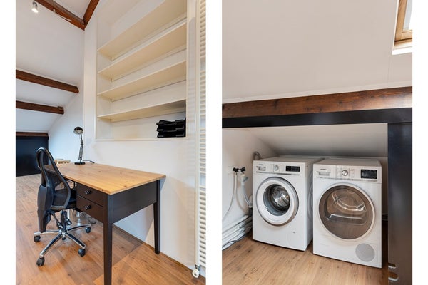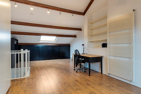 Zolderverdieping: hier valt gelijk het lichtinval op door de 2 grote dakramen. Op dit moment ingedeeld als een open slaapkamer met een studeer-/ thuiswerkplek. Beide zijden van de verdieping zijn afgewerkt met schuifdeuren in de knieschotten waardoor er ruim voldoen opbergruimte is. Tevens bevindt zich hierachter de opstelplaats voor de wasmachine en droger. Vaste kast met opstelplaats van de cv-ketel.