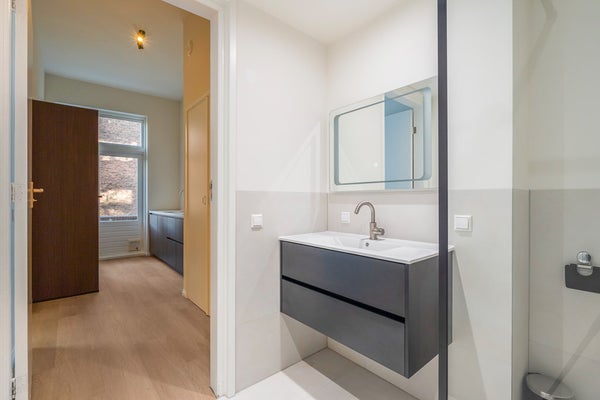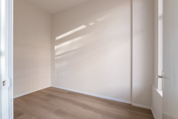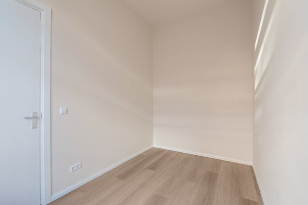 Aan de voorkant van het appartement is er een slaapkamer van standaard formaat, ideaal te gebruiken als een thuiswerkplek, logeerkamer of inloopkast. De hoofdslaapkamer bevindt zich aan de achterkant van het appartement, wat zorgt voor een rustige en comfortabele slaapomgeving.