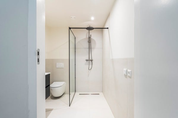 De stijlvolle badkamer is toegankelijk via de keuken en is ingericht met een inloopdouche, wastafel en toilet.