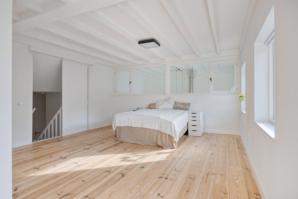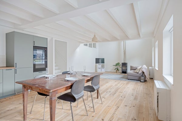 De woonkamer ademt warmte en sfeer, met haar hoge plafonds en prachtige houten balken die nog verwijzen naar het oorspronkelijke karakter van het pand. Een gezellige houtkachel zorgt voor extra comfort tijdens de koude wintermaanden. De natuurlijke overgang tussen keuken en woonkamer maakt de ruimte open en uitnodigend.