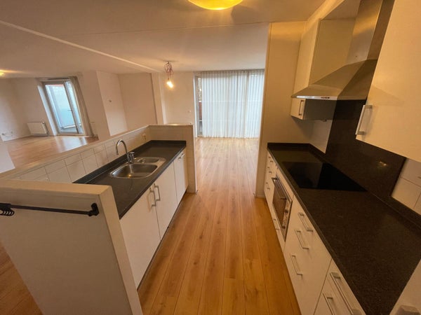 De ruime woning is gelegen op de eerste woonlaag. Entree woning, hal, apart toilet met fonteintje, inpandige berging met wasmachine/droger opstelling, drie slaapkamers, twee badkamers waarvan één en-suite, woonkamer (ca. 52 m2) met open keuken (ca. 6 m2) met bijkeuken en schuifpui naar het balkon (ca. 94 m2)