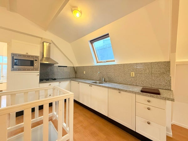 De lichte woonkamer/keuken met open keuken profiteert van veel daglicht dankzij Velux dakramen. De keuken is uitgerust met diverse inbouwapparatuur en een natuurstenen aanrechtblad.