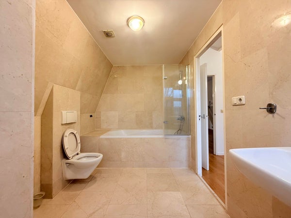 De slaapkamer ligt aan de achterzijde met uitzicht op het water. De badkamer is luxe afgewerkt met natuursteen en voorzien van een bad/douche, wastafel en wandtoilet.