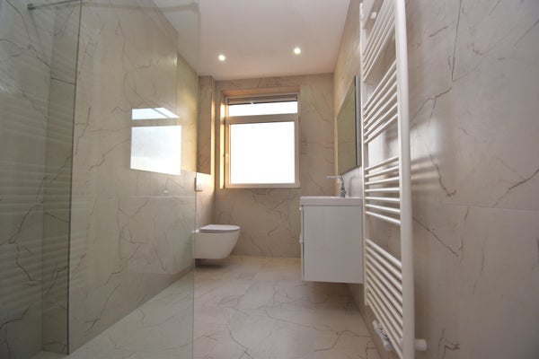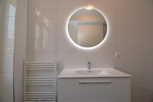 De nieuwe badkamer heeft een ruime inloopdouche, handdoeken radiator, zwevend toilet en badmeubel met verlichte spiegel. 2e moderne badkamer aanwezig op de 3e verdieping.
