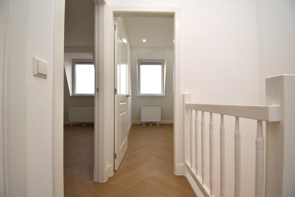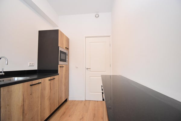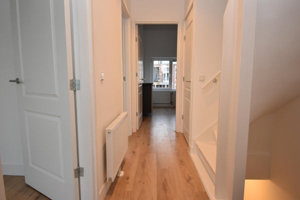 Gemeenschappelijke entree op straatniveau met de privé voordeur op de 2e etage. U komt binnen in een hal welke toegang verleent tot een nieuwe keuken. De keuken is compleet nieuw en voorzien van alle gemakken, koel-vriescombinatie, combi-oven, vaatwasser, inductiekookplaat en afzuigkap.