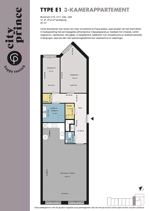 Dit ruime 3-kamerappartement van 87 m² bevindt zich in CityPrince in Den Haag, op loopafstand van het centrum. Met een open keuken die aansluit op de woonkamer, is de moderne keuken voorzien van een koelkast met vriesvak, vaatwasser, combimagnetron, kookplaat en afzuigkap. De badkamer beschikt over een inloopdouche, ligbad en dubbele wastafel. Het appartement heeft twee ruime slaapkamers, een separaat toilet, en een berging met wasmachineaansluiting. Bewoners kunnen genieten van een fraaie binnentuin. Dankzij de grote raampartijen en openslaande deuren is de woning licht. Bovendien zijn er zonnepanelen op het dak voor duurzame energie. CityPrince ligt centraal, ideaal voor winkelen, uit eten en nabijheid van openbaar vervoer.
