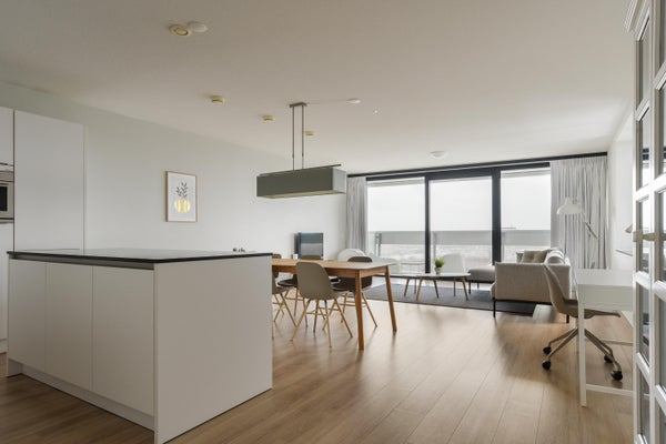 Gesloten entree met servicemanager en liften naar de verdieping. Entree: Ruime hal met toilet met fonteintje, zeer ruime woon/eetkamer met een waanzinnig mooi uitzicht. De luxe open woonkeuken met eiland is voorzien van diverse inbouwapparatuur. De open keuken bevat een volledige inventaris met potten, pannen, borden, bestek etc. Vaste kasten met huishoudelijk apparatuur zoals wasmachine, droger, stofzuiger, strijkplank en strijkijzer. Badkamer met ligbad, aparte douche en wastafel. Ouderslaapkamer en 1 kinderslaapkamer. In de ruime slaapkamerkasten vindt u schone handdoeken en beddengoed.