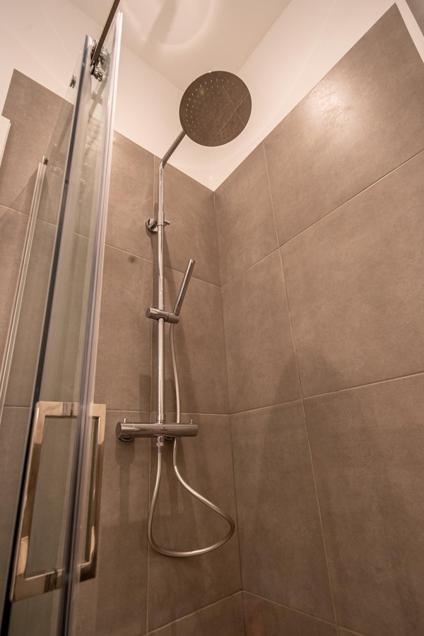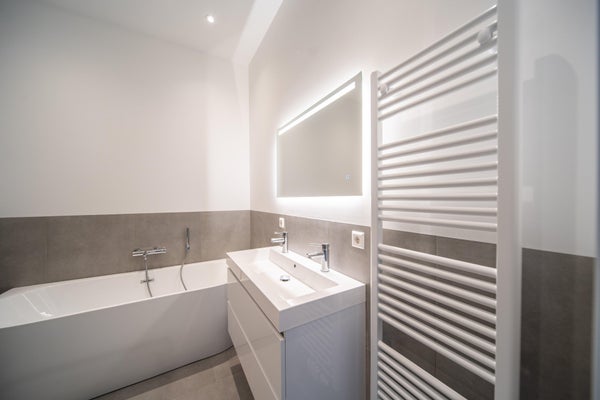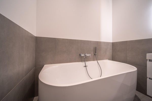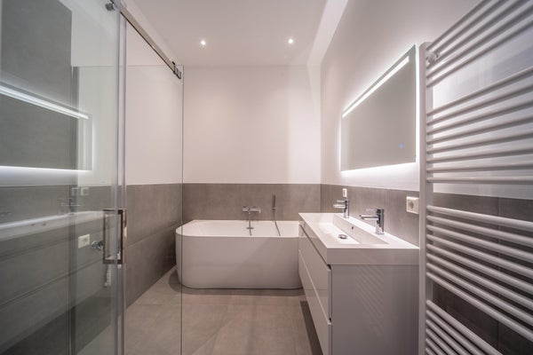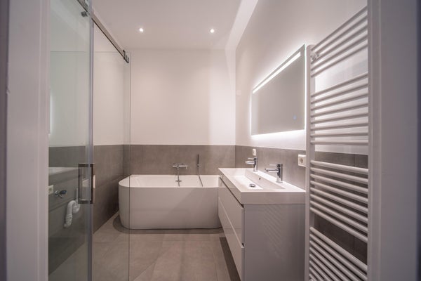- Centraal gelegen badkamer met ligbad, inloopdouche, dubbele wastafel, verwarmde spiegel en wasmachineaansluiting