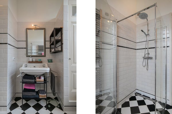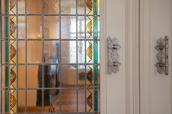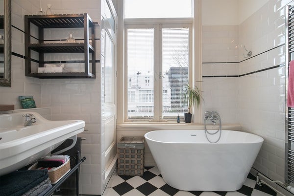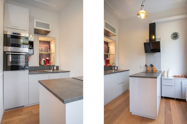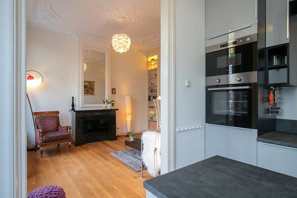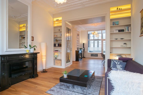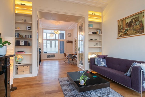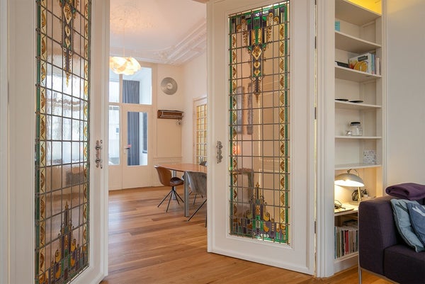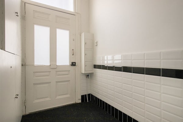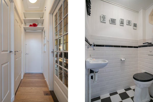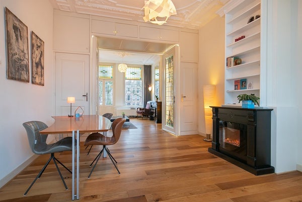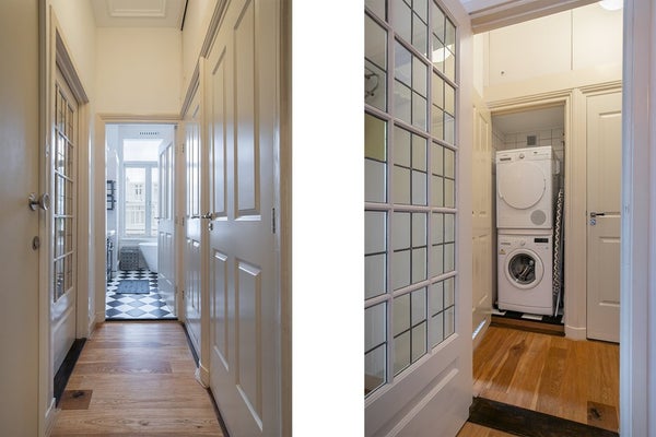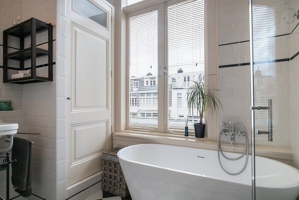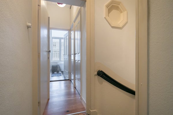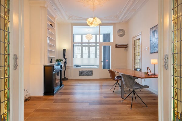 Entree op de begane grond, interne trap naar de eerste verdieping, entree appartement. Gang met aparte toiletten en wastafel, kast met wasmachine en droger. Heldere en ruime woon/eetkamer die kan worden gescheiden met originele ensuite deuren met glas-in-lood. Mooie ornamentplafonds, houten vloeren en een Frans balkon zijn aanwezig. De moderne keuken bevindt zich aan de voorkant van het pand en is uitgerust met alle noodzakelijke inbouwapparatuur. Badkamer met regendouche, bad, wastafel met spiegel en handdoekradiator. Het appartement verkeert in uitstekende staat en de huurprijs is inclusief het gebruik van alle apparatuur, meubels, armaturen en huisraad.