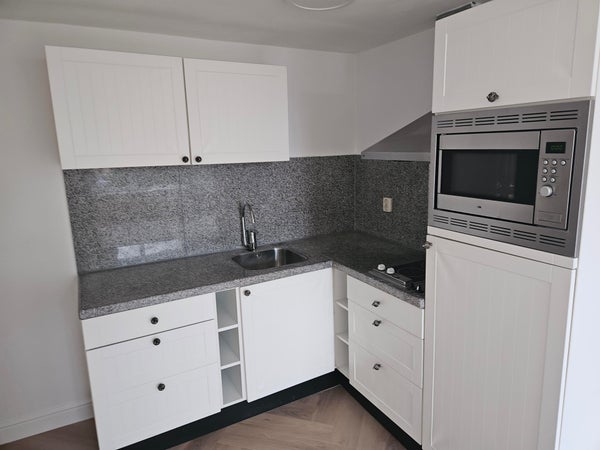 Via de gemeenschappelijke voordeur op straatniveau betreedt u met de privévoordeur van het appartement op de 1e etage. U komt binnen in een halletje waar zich een inbouwkast bevindt en een wasmachine staat opgesteld. Via de hal betreedt u de lichte woonkamer (ca. 5.25x4.58m), welke voorzien is van een open keuken (ca. 2.11x2.00m). De open keuken is voorzien van verschillende apparatuur, waaronder een kookplaat, afzuigkap, combimagnetron, en een koelkast met vriesvakje. De ruime slaapkamer (ca. 4.28x2.31m) is gelegen aan de achterzijde van het appartement. Verder is dit appartement voorzien van een luxe badkamer welke voorzien is van douche faciliteiten, vaste wastafel en toilet!
