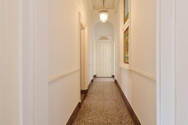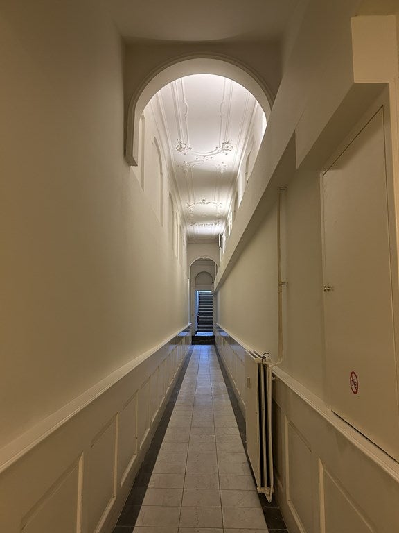 Je merkt meteen dat dit appartement anders is dan andere woningen in het centrum. De lange gang leidt je eerst langs de prachtige master bedroom – ruim en licht, met meer dan genoeg plek voor een queensize bed én een flinke kledingkast. Verderop vind je de eetkamer, die grenst aan de royale woonkamer. Handig: met de fraaie schuifseparatie kun je hier flexibel schakelen tussen open en intiem dineren. Het karakteristieke plafond in de eetkamer springt in het oog; details als deze geven dit huis een uniek, bijna artistiek karakter.