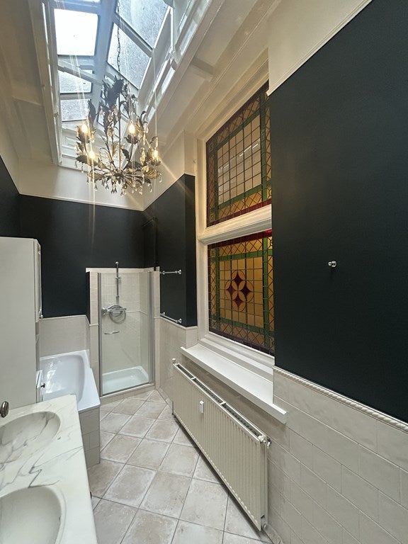 Ook de keuken laat qua ruimte en uitstraling niets te wensen over. Modern, maar karaktervol. Er is een royaal werkgedeelte, diverse inbouwapparaten en een groot – vrijstaand – gasfornuis: ideaal om culinair los te gaan. Daarnaast sluit alles in de badkamer naadloos aan op de rest van het appartement; een moderne inrichting met een subtiele knipoog naar de stijl van het pand, dus zowel functioneel als tijdloos mooi.