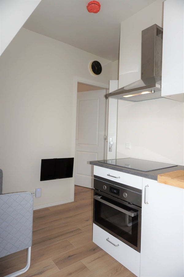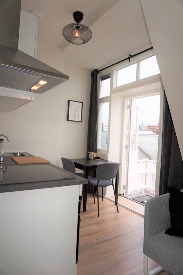 entree, woon-/eetkamer met openslaande deuren naar het eigen dakterras. Moderne open keuken voorzien van kookplaat, afzuigkap, koel/vries combinatie, combi magnetron en alle benodigde keukengerei zoals borden, bestek en pannen; Separate slaapkamer met kledingkast en tevens toegang tot de badkamer met inloopdouche, wastafel en wc.