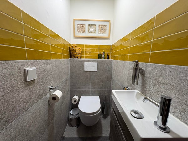 Het toilet is uitgerust met een hang toilet, wandmeubel en wasbak voor extra gemak en heeft dezelfde stijl als de badkamer met een strakke uitstraling.