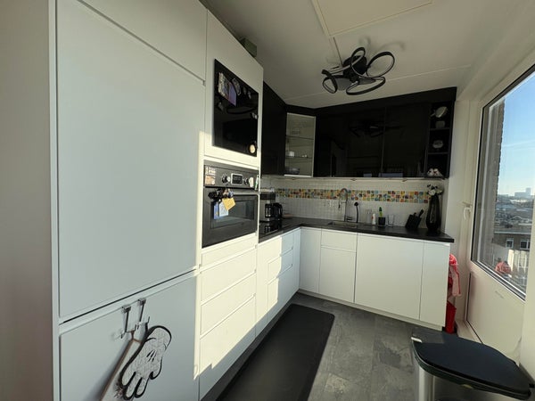 De keuken, voorzien van alle gemakken zoals een electrische kookplaat, vaatwasser en inbouw magnetron combi oven, is functioneel en praktisch opgezet. Grote raampartijen geven veel licht in het appartement.