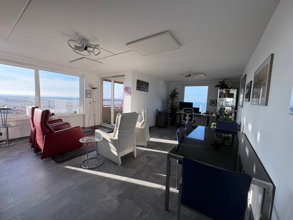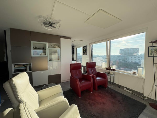 De L-shaped woonkamer heeft een knusse uitstraling met een in de hoek gecreëerde werkplek met fantastisch uitzicht. Vanuit de woonkamer betreedt u het balkon waarvan u van de mooiste zonsondergangen kunt genieten.