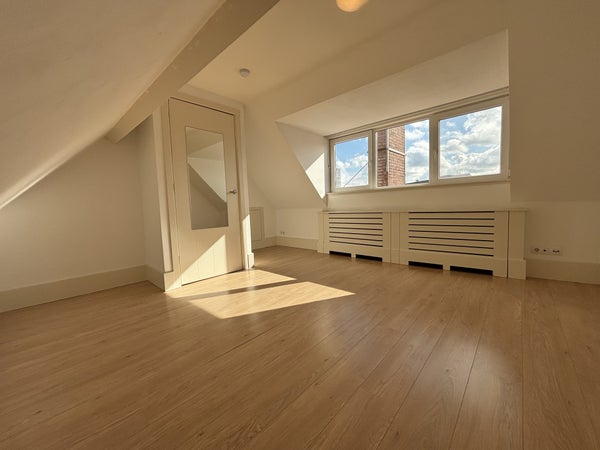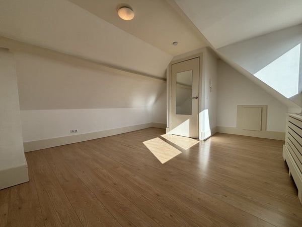 Met de trap gaat u naar de tweede slaapkamer. Deze is ruim en heeft schuine wanden. De ruimte is voorzien van dubbele beglazing en een Veluxraam.