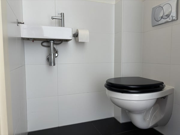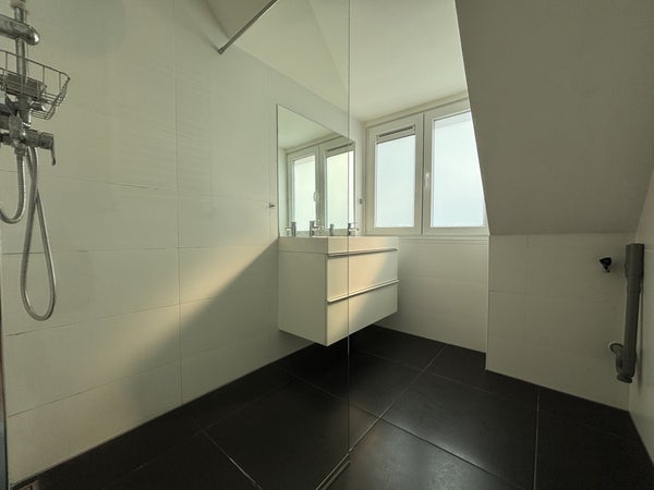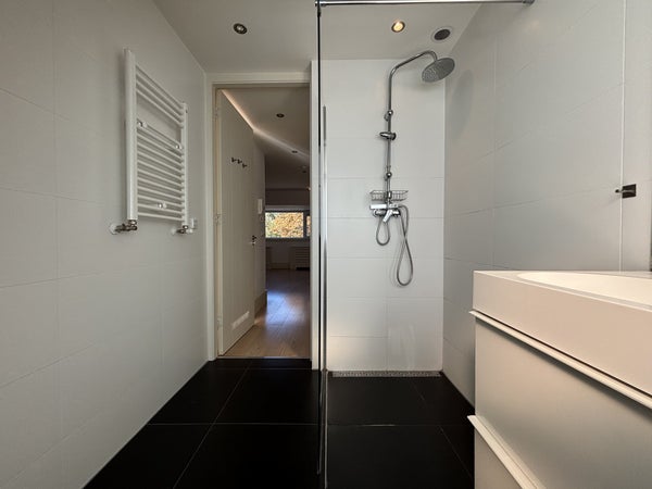 Op de eerste etage bevindt zich ook de badkamer. Deze is compleet betegeld en voorzien van een inloopdouche met regendouche, handdoekradiator en een moderne wastafel. De wasmachineaansluiting is hier ook aangelegd.