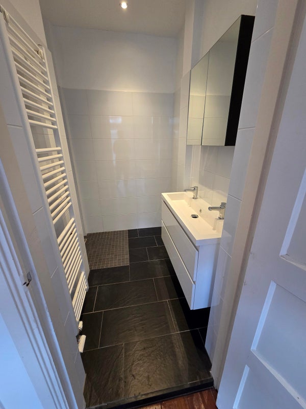 Hoofd slaapkamer aan achterzijde gelegen is annex nette badkamer voorzien van inloopdouche, vaste wastafel en handdoekverwarming. De slaapkamer heeft een inbouwkast en deur naar de tuin.