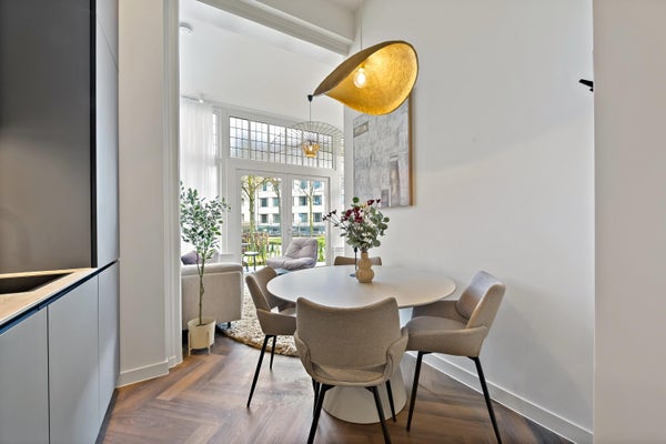 Dit heerlijke studio appartement is gelegen op de begane grond. De entree is bereikbaar via de centrale voordeur van het indrukwekkende gebouw. Voordeur met hal. Toegang tot de keuken, welke van alle gemakken is voorzien, denk aan een vaatwasser, een inductie kookplaat, een koelvriescombinatie, een Quooker voor direct kokend water en voldoende kastruimte. Via de keuken toegang tot de schitterende badkamer met ligbad, inloopdouche, wastafel met meubel, spiegel met verlichting en verwarming en twee handdoek radiatoren. Separaat toilet in dezelfde stijl als de badkamer. De keuken loopt over naar de fenomenaal gerenoveerde woon-eetkamer met visgraat vloer, met dubbel openslaande deuren naar het ruime terras. Via de woonkamer is de ruime slaapkamer te bereiken (ca. 8m2). De woning is door de plafondhoogte en raampartijen licht en luxe. Ruime achtertuin van ca. 30m2 gelegen op het oosten. De plafondhoogte in dit appartement is maar liefst 3.7m!