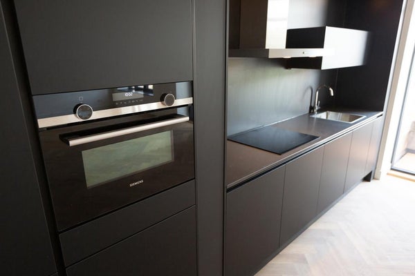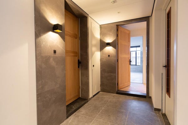 Afgesloten hoofdentree, trap of lift naar 2e verdieping, entree appartement met videophone, gasten wc met fontein, living met open keuken in zwarte kleurstelling met alle inbouwapparatuur. Vanuit deze ruimte toegang tot het balkon. twee goed formaat slaapkamers, moderne design badkamer met inloopdouche, wastafel met meubel en wc. Separate ruimte met o.a. aansluiting voor wasmachine en droger.