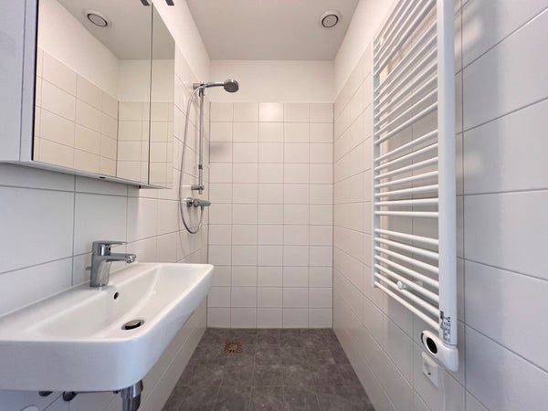 Deze 2-kamer woning wordt gestoffeerd opgeleverd, d.w.z. met fraaie PVC vloeren met vloerverwarming, nette geschilderde muren met glasvliesbehang, luxe badkamer met douche en ligbad, wastafel en spiegelkast en een volledig ingerichte keuken met combi oven/magnetron, koelkast, elektrische kookplaat en afzuigkap. De badkamer is voorzien van een moderne douche, spiegelkast met verlichting en een ligbad.
