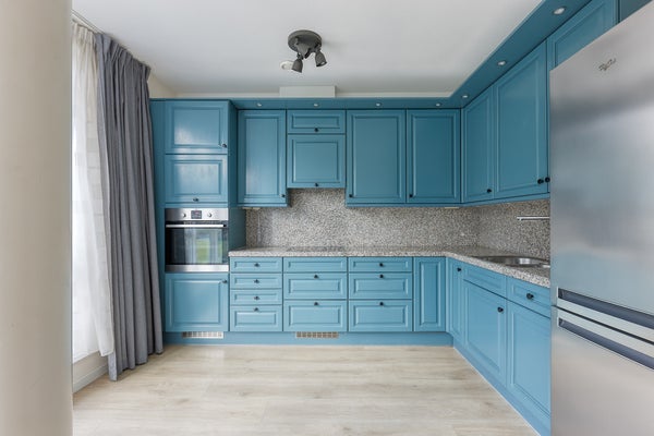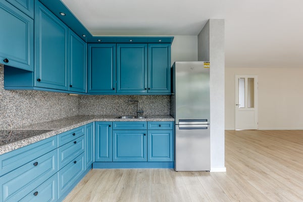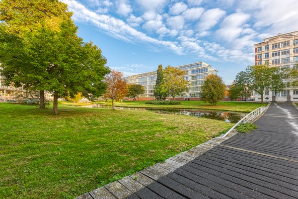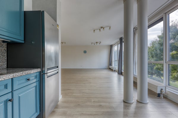 Entree van de woning naar de ruime hal. Hier bevindt zich een ruime bergkast waar de wasmachine en droger staan opgesteld. De royale woonkamer is licht en ruim opgezet dankzij de grote raampartijen en biedt prachtig uitzicht over het park. De open keuken is uitgevoerd in een originele stijl en beschikt over alle benodigde inbouwapparatuur zoals een inductie kookplaat met afzuigkap, oven, vaatwasser, koelkast en vriezer.
