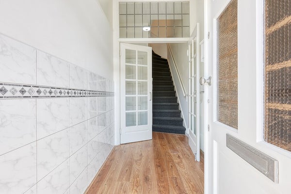Entree woning op straatniveau via de voortuin welke bewoners kunnen gebruiken om fietsen te stallen. Trap naar de eerste verdieping, toegang tot het appartement naar een kleine hal.