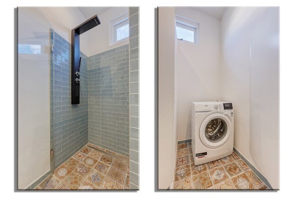 De mooie, moderne badkamer is ruim opgezet en beschikt over een regendouche, dubbele wastafel met wastafelmeubel en design radiator. Tevens staat de wasmachine hier opgesteld. In de hal bevindt zich een separaat toilet met fonteintje.