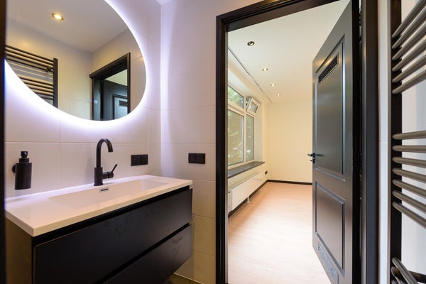 • Twee Gerenoveerde zeer luxe badkamer met een regendouche, design radiator, wastafel met kast en spiegel met geïntegreerde verlichting en ligbad;
