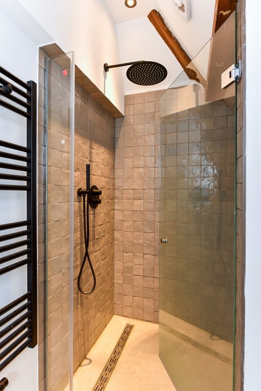 Trap naar de 2e verdieping met 2 ruime slaapkamers. In de gang kan nog een toilet worden gevonden, evenals een inbouwkast, wasruimte en deuren naar het zonnige buitenterras. Een ladder leidt naar de 3e verdieping, die als studeerkamer of gastenkamer kan functioneren. De moderne badkamer heeft een bad, inloopdouche, wastafel en handdoekradiator.
