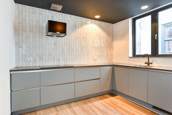 Entree vanuit de straat naar een kleine hal met de deur naar het appartement. Trap naar de eerste verdieping. Ruime woonkamer met grote ramen en mooie houten afwerkingen. Toegang tot het eerste terras, hal naar modern toilet met kraan. Toegang tot de eet-/keukenruimte met een gloednieuwe keuken met apparatuur zoals een oven, magnetron, vaatwasser, Quooker (kokend water uit de kraan) en voldoende opbergruimte.