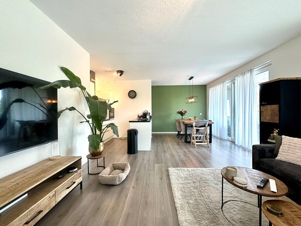 De ruime woonkamer met open keuken biedt toegang tot het balkon.