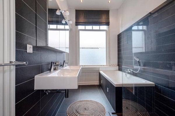 • 2e verdieping: Twee royale slaapkamers, waarvan één met airconditioning en eigen balkon. Luxe badkamer met ligbad, inloopdouche en dubbele wastafel. Toegang tot het tweede dakterras. Praktische bergkasten voor wasmachine en C.V., aparte wc.
